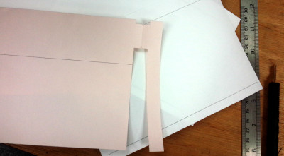 大型ペーパーカッターでざっくり切り分けた後、こんな風にカット。変な形になっているのは、折り返して、傷みやすい耳部分を補強する作戦。