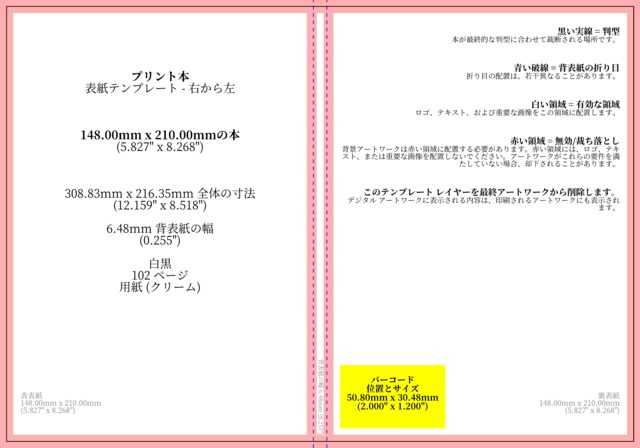 版の全体サイズから、印刷不可の領域、背表紙の折り目や文字入れ可能な領域、印刷時にAmazonによって自動的に追加されるバーコードの位置など、細かい数字が得られます。