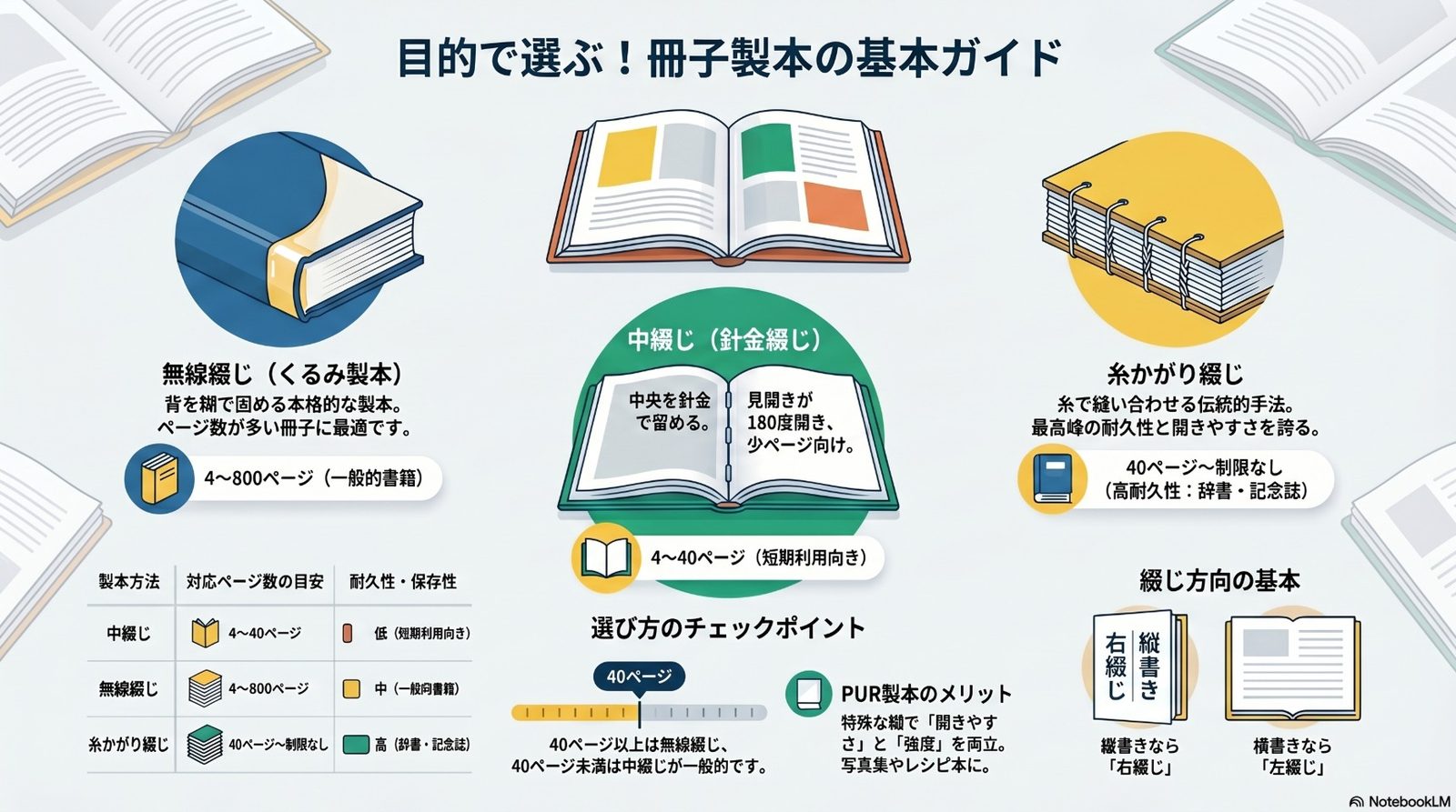 大きな区分けとしてハードカバーこと「上製本」とソフトカバーこと「並製本」があります。その中でさらに、いろいろ綴じ方の分類があります。以下に代表的なものをざっくりと紹介しておきます。いちおうコストの低い順で並べてみました。